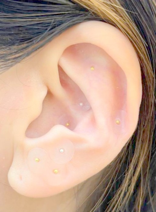 専用のチタンのシールを貼るんですが、私はシンプルなゴールドとシルバーをミックスしたデザインを選んで、片耳に7個ずつ、合計14個つけてもらいました。